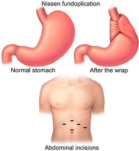 Yaşam tarzı değişikliklerine cevap vermeyen ve şikayetlerinin geçmesi için sürekli ilaç kullanmak zorunda olan , ilaç kesildiğinde şikayetleri hemen ortaya çıkan hastalara cerahi tedavi önerilir. Reflü hastalığına bağlı komplikasyon (darlık, dokuda değişiklik, astım benzeri bulgular) gelişen hastalara da cerrahi önerilir. Nissen fundoplikasyonu geleneksel olarak karnın yaklaşık15 cm kadar açılmasıyla yapılan ve hastanın 5-7 gün yatışını gerektiren bir işlem olmuştur. Ancak günümüzde Reflü hastalığının seçkin cerrahi tedavisi laparoskopik (kapalı) cerrahidir. Yalnızca 5 adet 1-2 cm’lik delikler açılarak yapılmaktadır. Hastalar daha hızlı ve daha az ağrıyla iyileşmektedir. Yara iltihaplanması gibi komplikasyonlarda daha azdır. Yaklaşık 1-2 hafta içinde çalışmaya dönmek olasıdır. Deneyimli ellerde yapılan laparoskopik reflü ameliyatlarında başarı oranı %95’ler civarındadır.